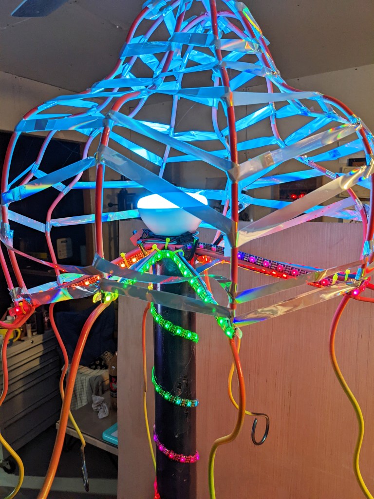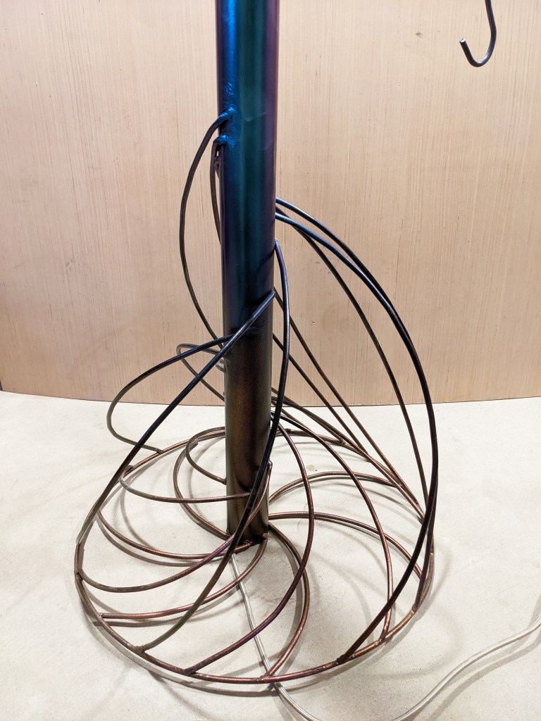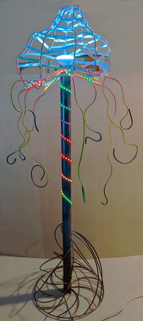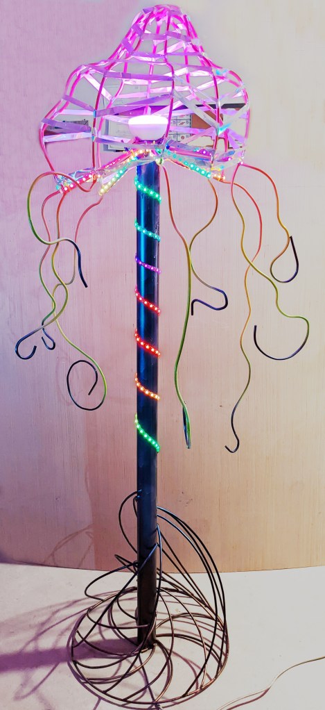 Materials: Steel Rod/Tubing, LED Strip, Light Bulb, Spray Paint, Reflective Foil.